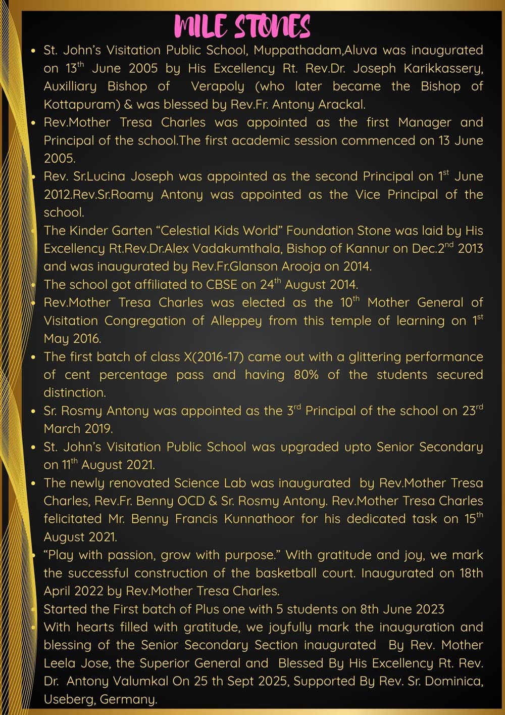 St. John’s Visitation Public School was founded under the patronage of Late Archbishop Daniel Acharuparambil Bishop of Varapoly. Rev. Fr. Antony Arackal was the initiator of the School. It was officially inaugurated by His Excellency Rt. Rev. Dr. Joseph Karikkaserry then Auxiliary Bishop of Varapoly. Rev. Mother Mary Caroline, the founderess sowed the tiny seed of the School. On the protection, care and concern of Almighty God, Sr. Tresa Charles, First Manager watered and nurtured the seed to a fully fledged tree with buds, flowers and fruits. The strong loving hands and hearts of a team of eminent sisters and teachers helped her for the development of the School.